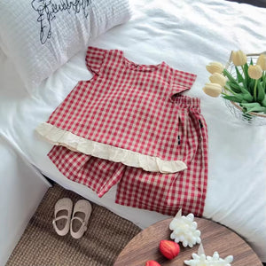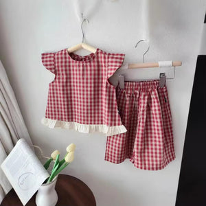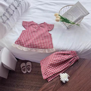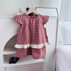 2025 Girls Casual Summer Plaid Two-Piece Set New Korean Style Fashion Flying Sleeves for Kindergarten Baby Suit