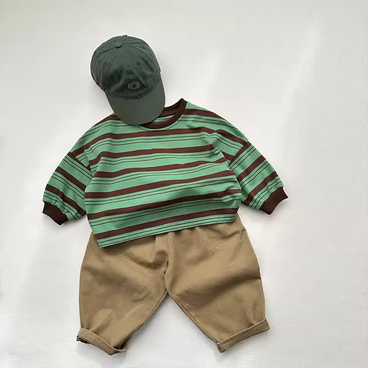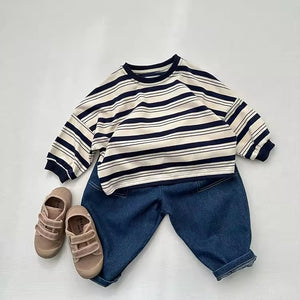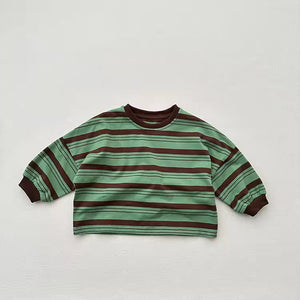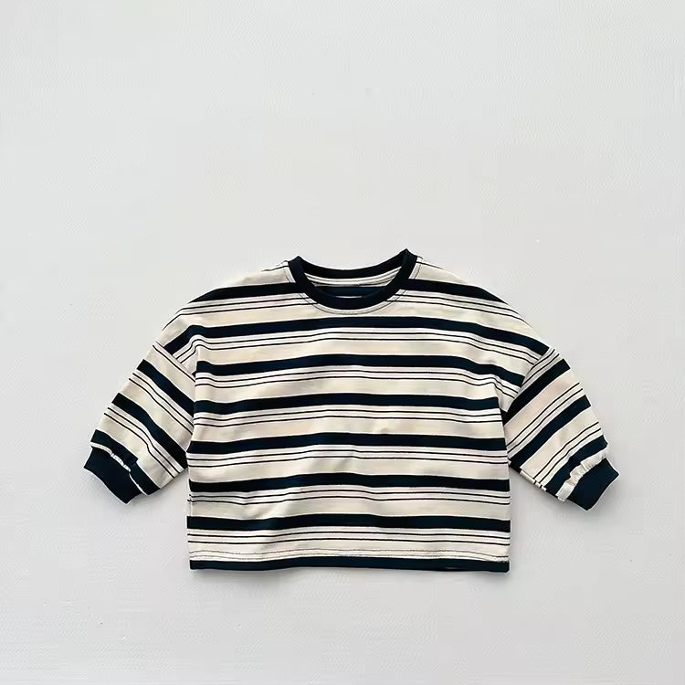 Spring and Autumn New Korean Style Baby T-shirt Striped Loose Long Sleeved Sweatshirts Retro Style Kids Tops