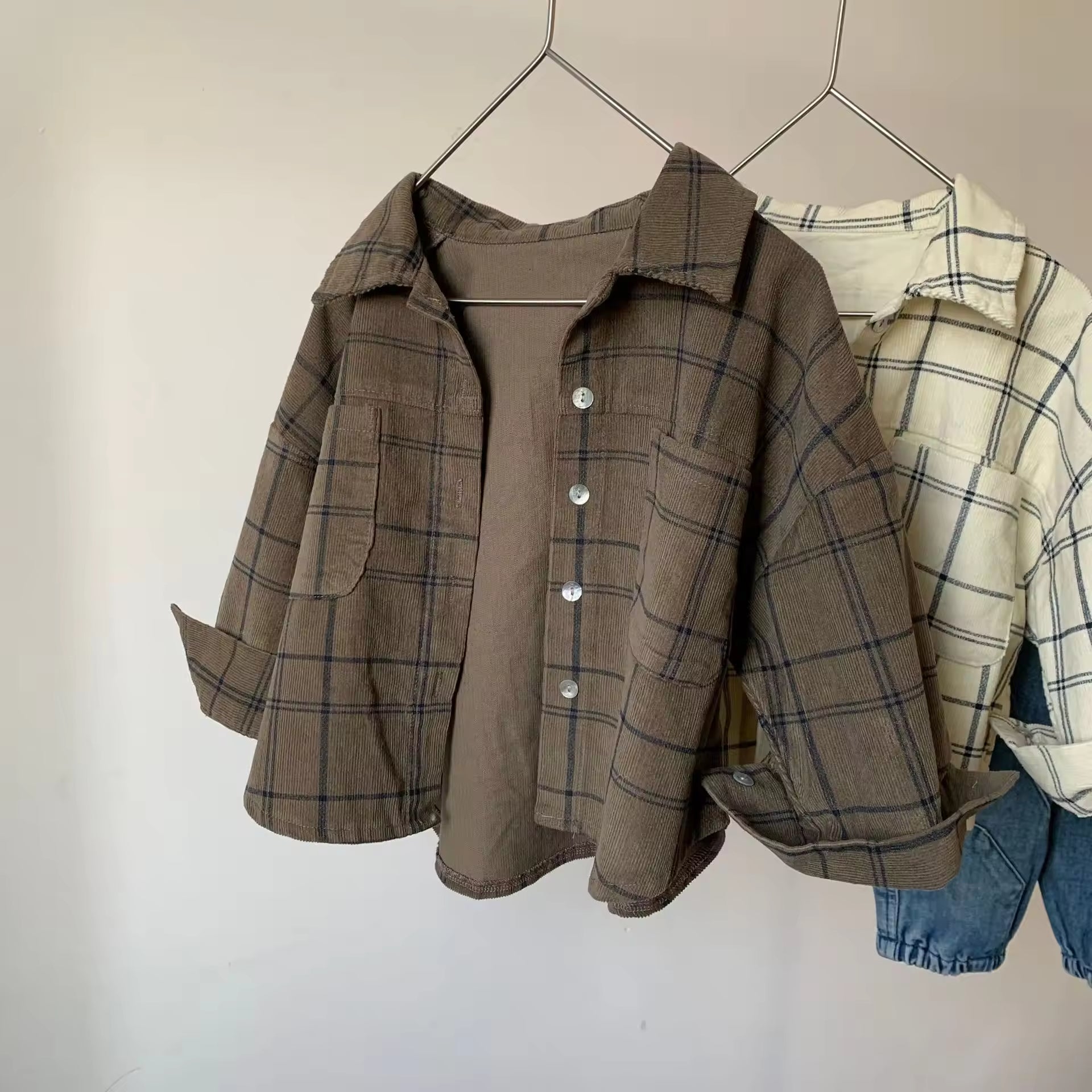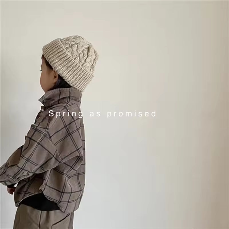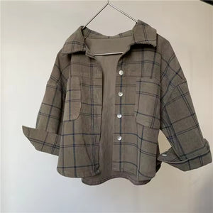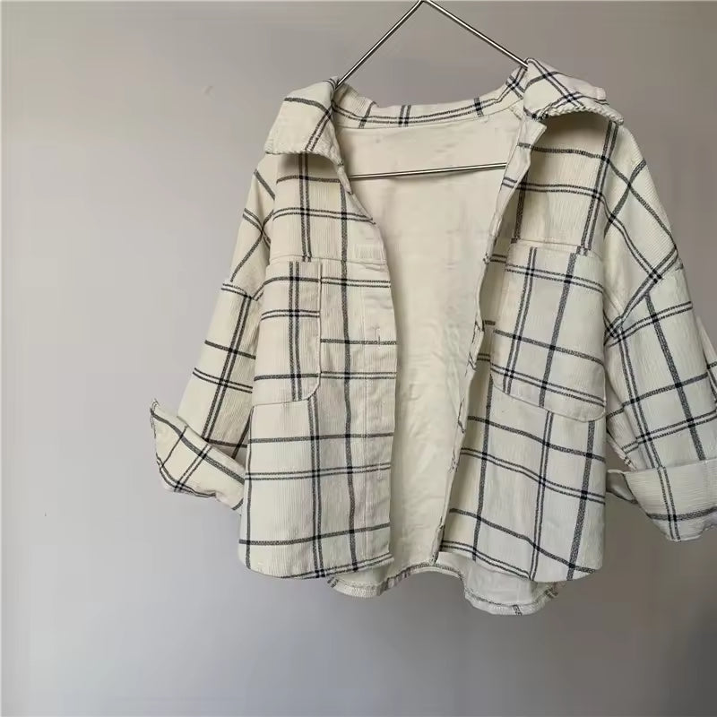 2025 Autumn New Collection Long-sleeved Corduroy Checked Shirts for Boys and Girls Children's Retro Style Casual Tops