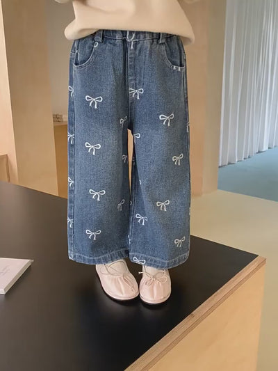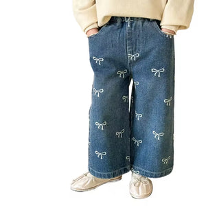 2025 Autumn and Winter Children's Clothing New Style Baby Pants Full Printed Bow Loose Fit Jeans Straight Legs Baby Trousers