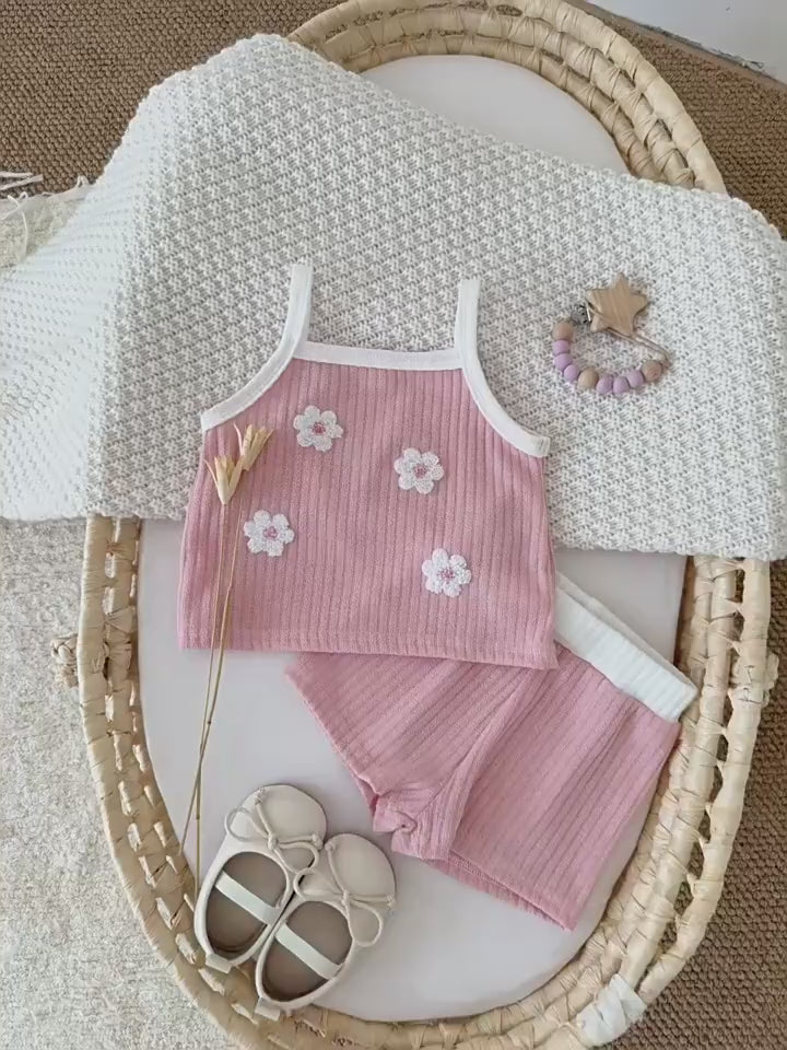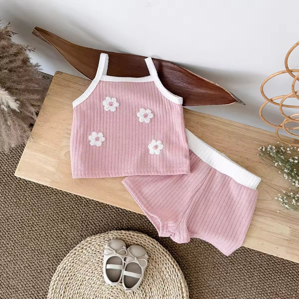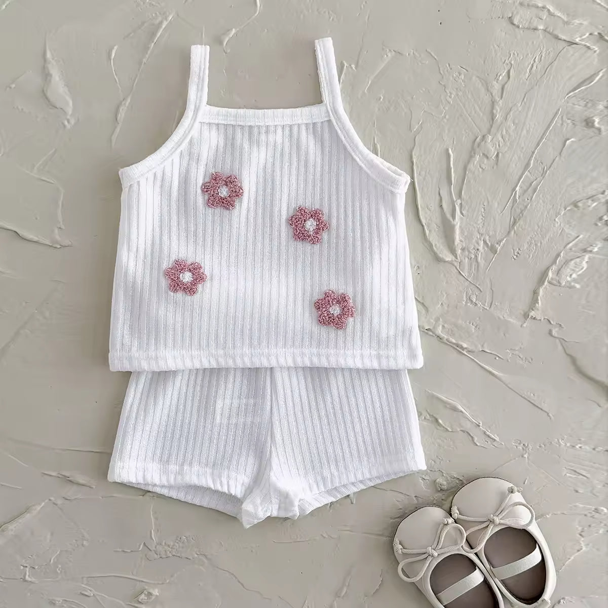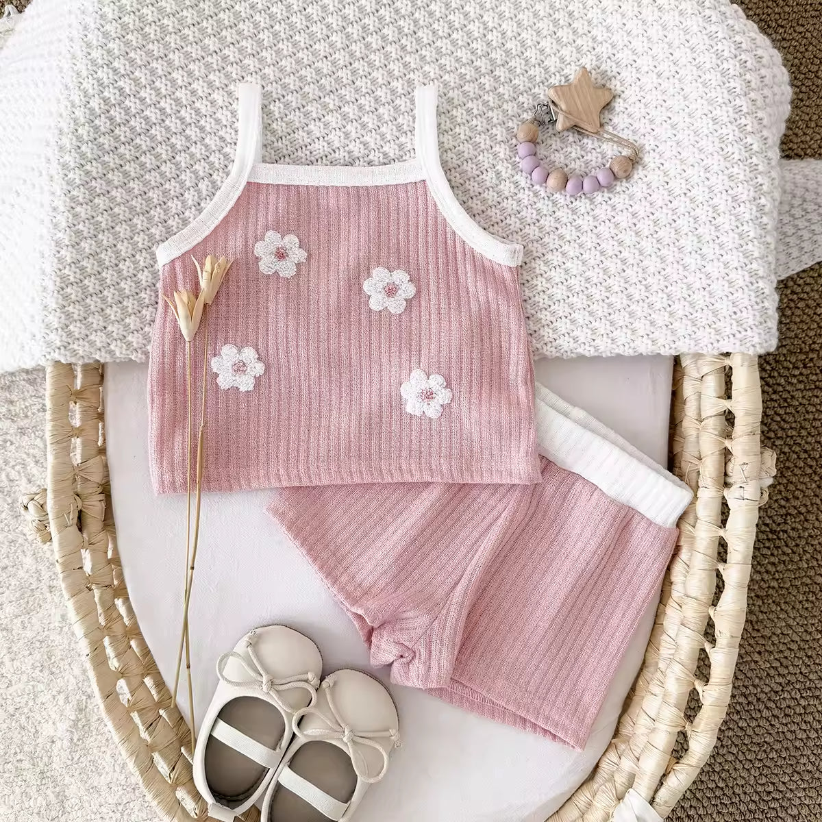 2025 New Fashion Summer Sleeveless Baby Suit for Girls Floral Embroidered Square Neck Casual Print Soft Breathable Two-Piece Set