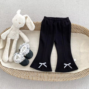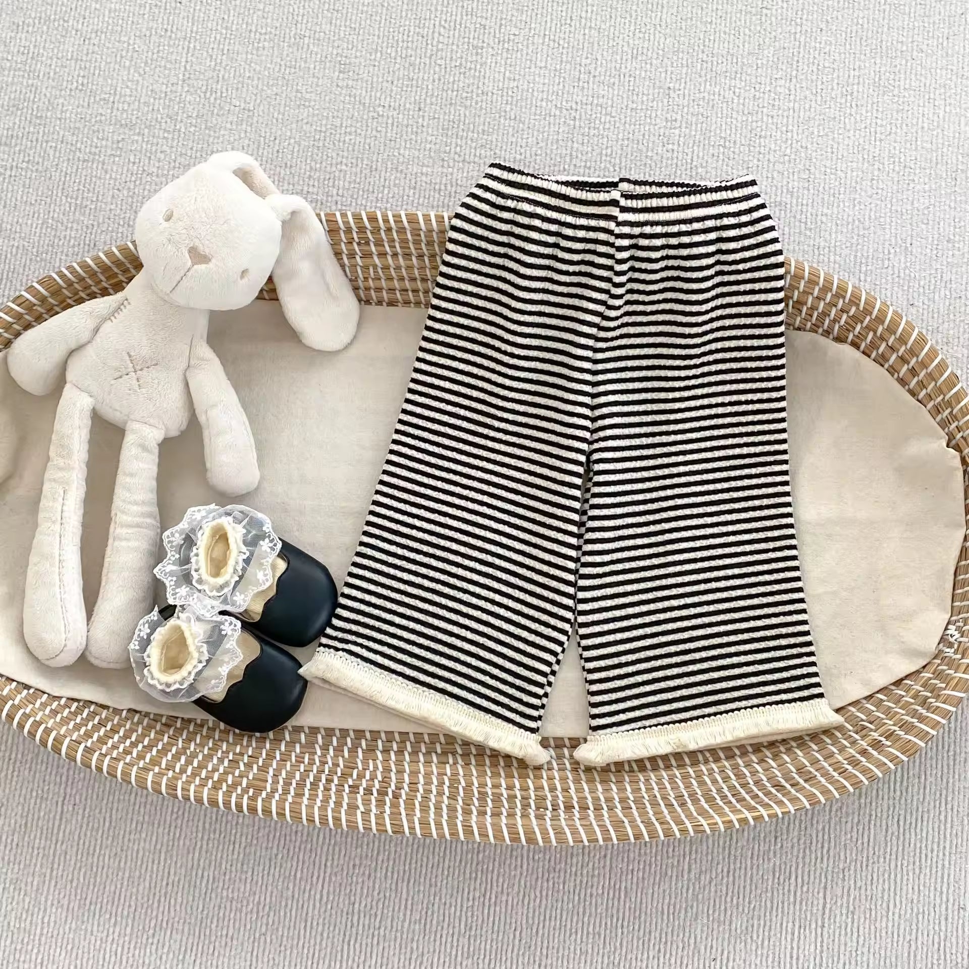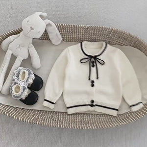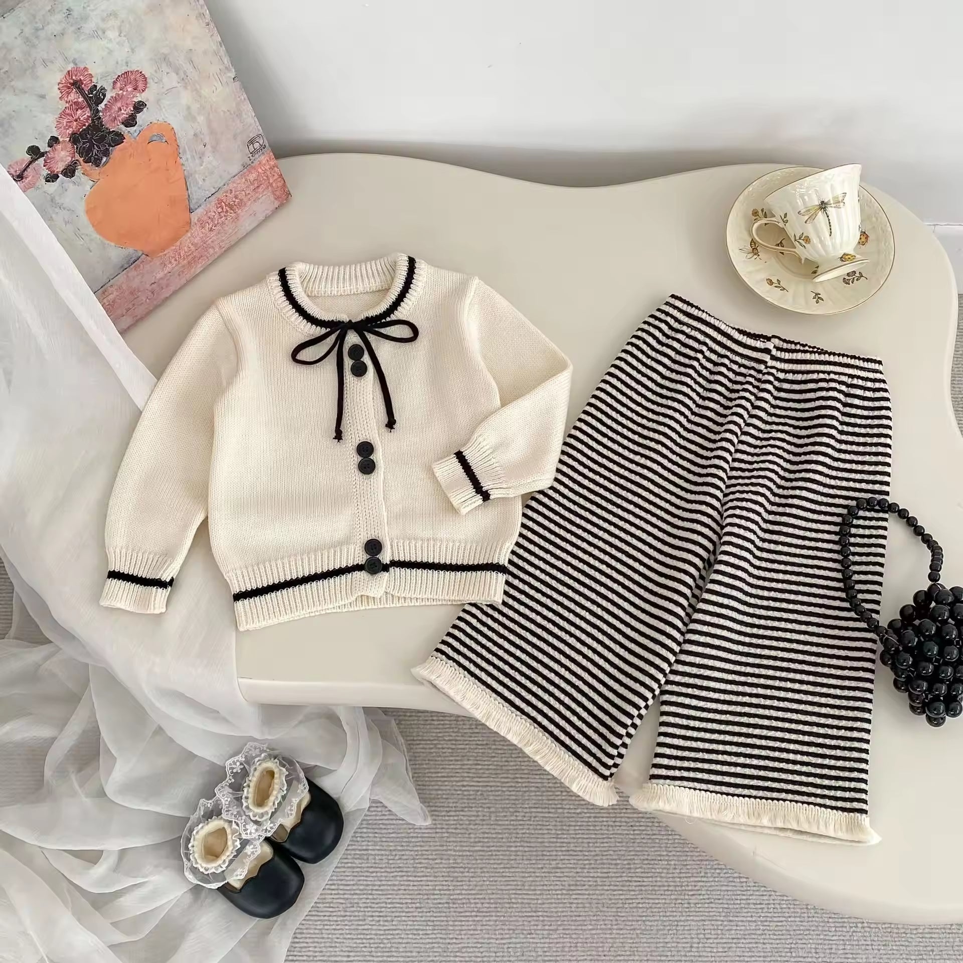 2025 New Girls' Round-neck Contrasting Color Cardigan Versatile Knitted Coat Flared Pants Autumn Two-piece Set