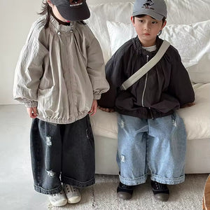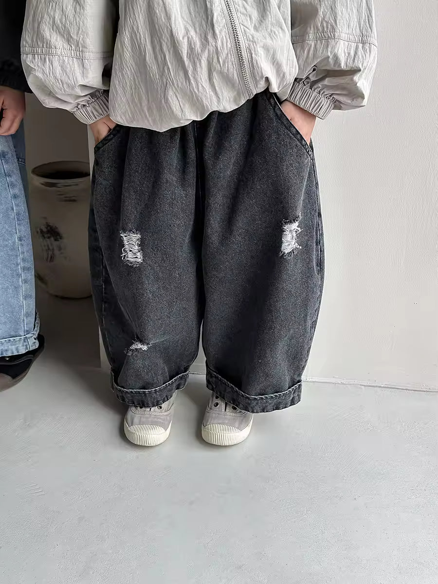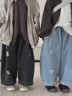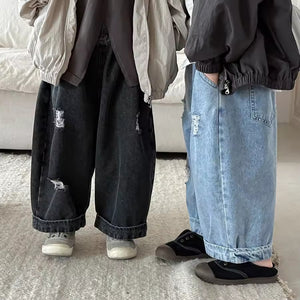 2025 Spring New Release Loose Vintage Wide-Leg Denim Baby Pants for Boys Girls Casual Straight Style Ripped Jeans Long Trousers