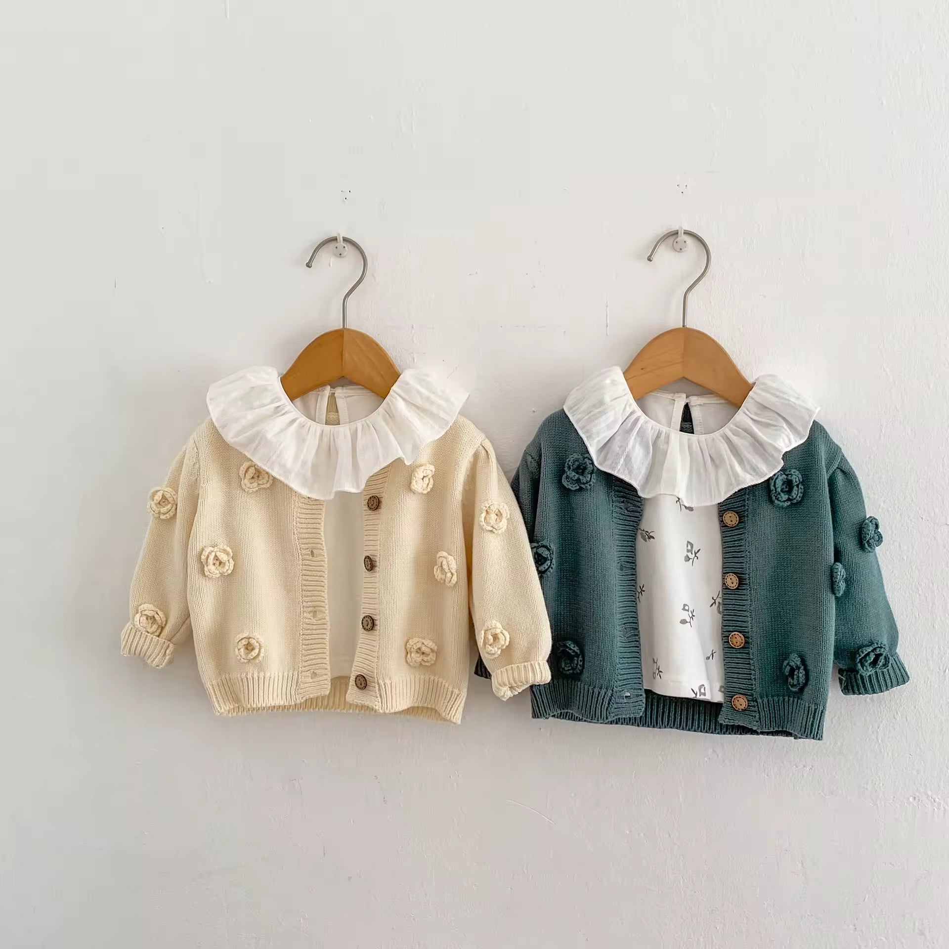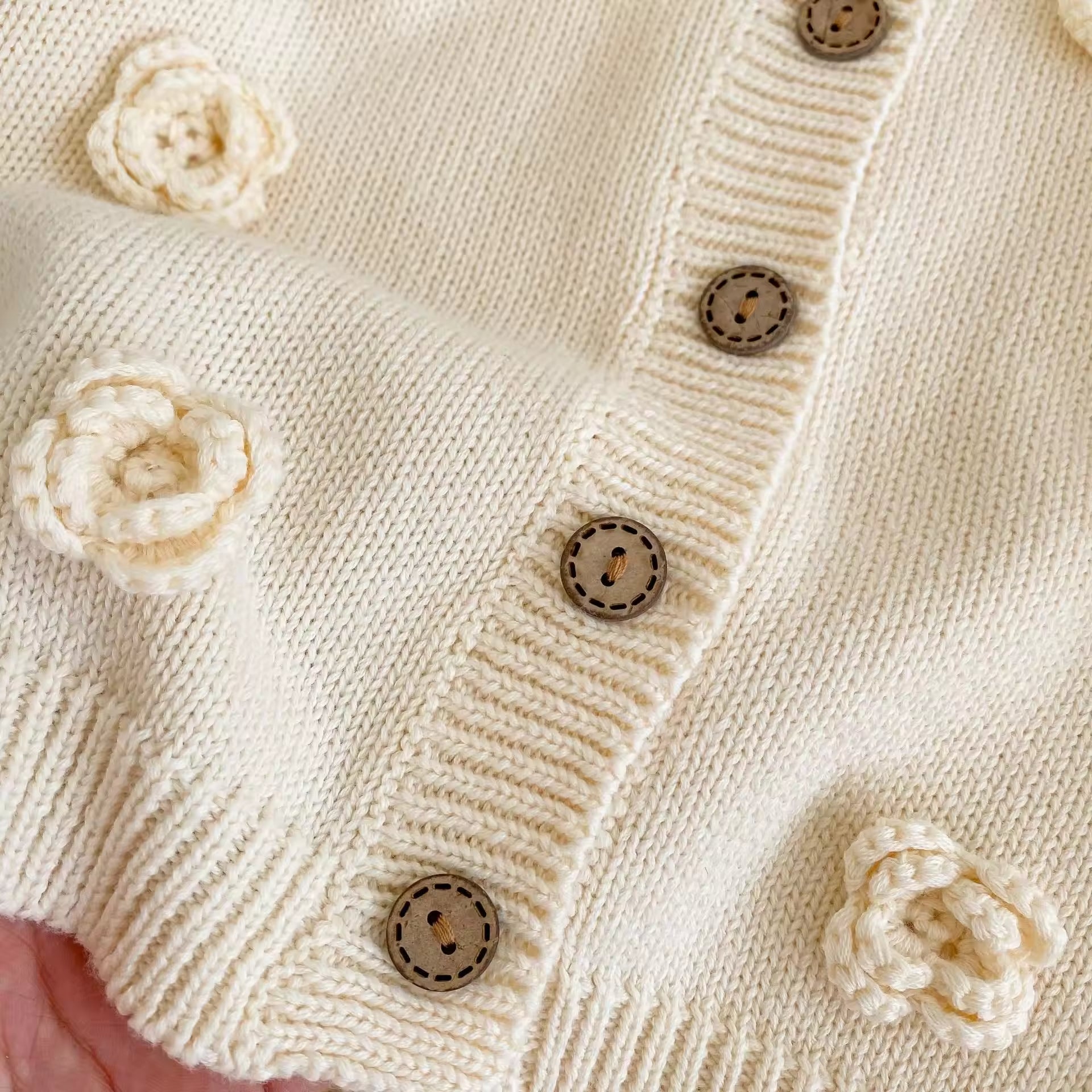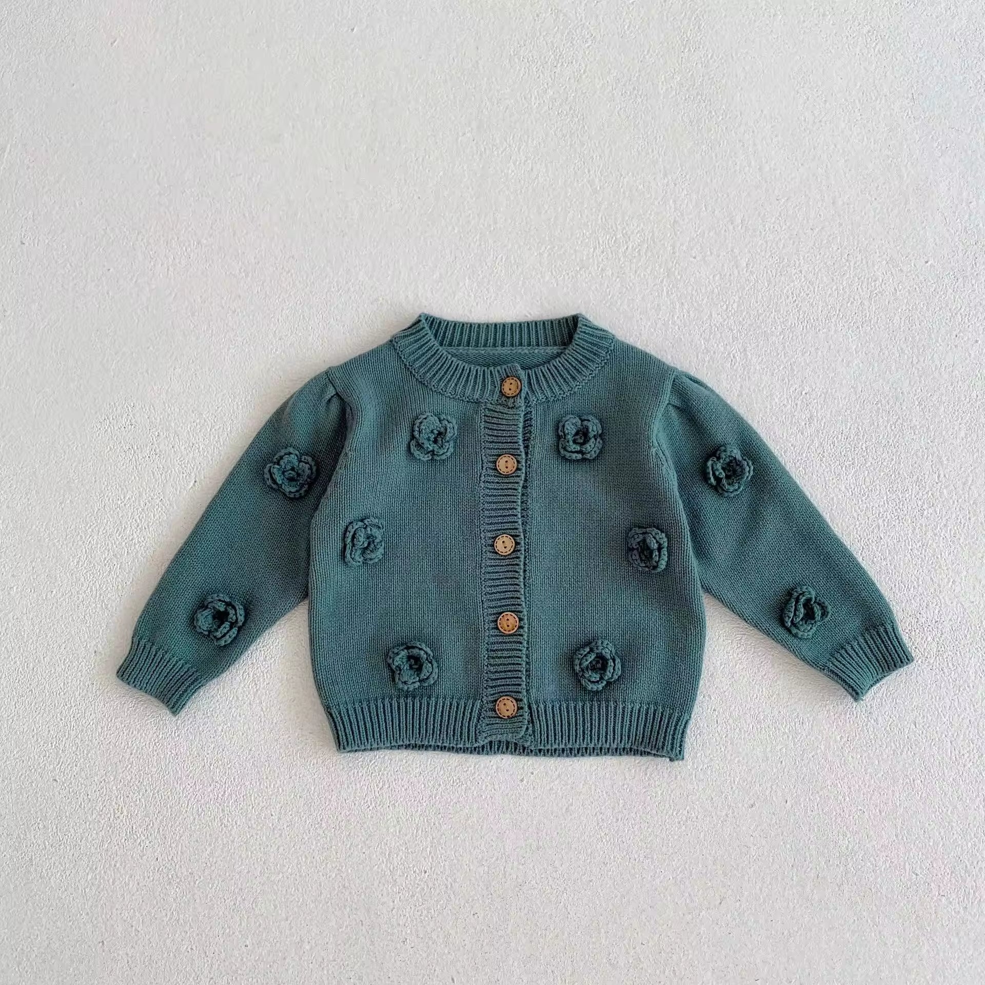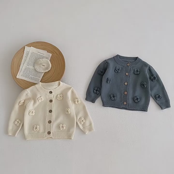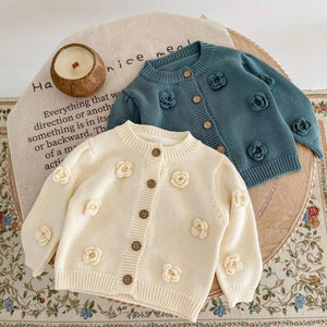 Autumn 2025 Baby Girl Casual Crewneck Baby Sweaters Cardigan Handmade Flower Knitted Cotton Button Decoration Baby Tops
